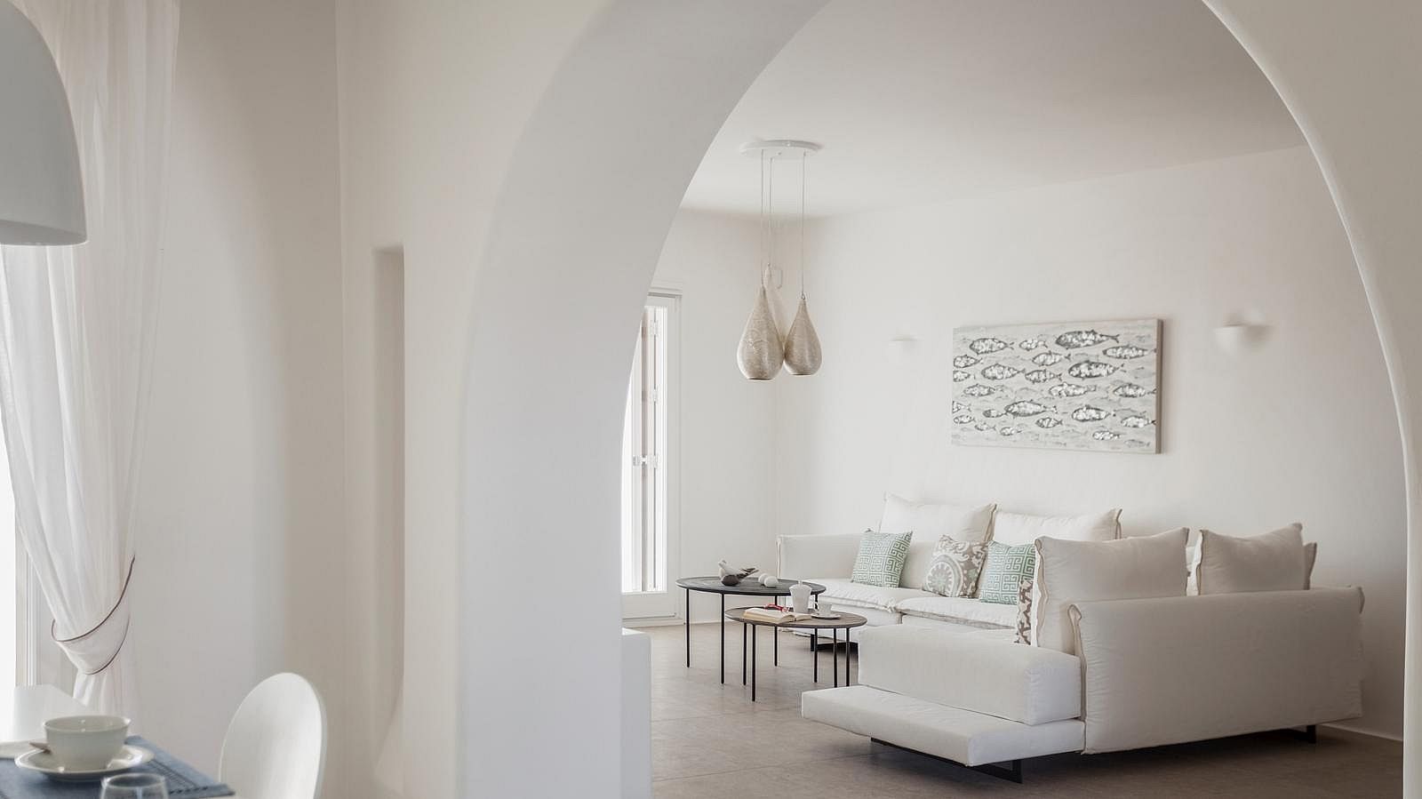 The interior spaces are contemporary and minimal with clear Cycladic influences. Everything is sparkling white, and utterly elegant, from the modern kitchen to the traditional arches, the built-in corners, beds and furniture. The spacious inviting living room has direct access to the terrace and the pool area. The impeccable en-suite bathrooms play with country elements. Splashes of color and some statement modern furniture complete a décor of eclecticism and comfort.